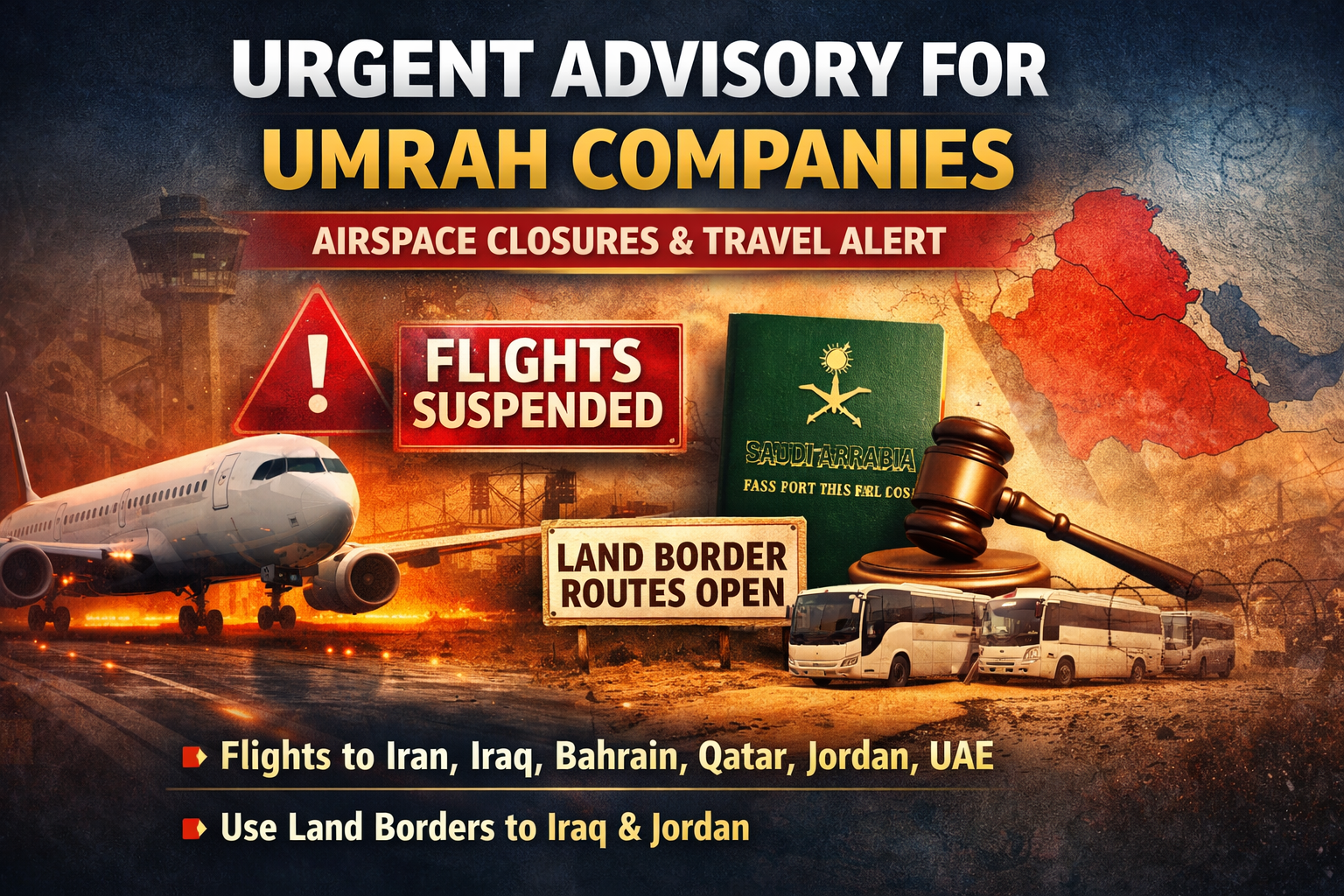 Umrah travel advisory, airspace suspension update, Saudi airport compliance, Umrah operations update 2026, land border travel Iraq Jordan, Umrah company guidelines, Jeddah airport coordination, Madinah airport compliance.